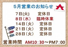 タイヤ館河内長野のホームページにごアクセス頂き、誠にありがとうございます。 明日5月7日火曜日の定休日に加え、 明後日、5月8日(水)はお休みを頂いております。 皆様には何かとご不便、ご迷惑をお掛け致しますが、何卒宜しくお願い致します。