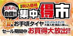 いつもタイヤ館河内長野のホームページをご覧頂き誠にありがとうございます。 大好評の『集中得市』10月28日(日)をもちましてセール終了となりました。 セール期間中は沢山のご来店誠にありがとうございました! これからもお得なセール、イベントを行いますのでご期待下さい!!