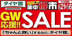 いつもタイヤ館河内長野をご利用いただき誠にありがとうございます。 只今当店では【GW応援!!SALE 集中得市】を開催中です!! 今日と明日の残り2日間!!セール期間は5月6日(日)まで★★ また同時開催の【ミニバン専用タイヤフェア】も好評開催中です♪♪ しかも今回のセールは、前回のセー...