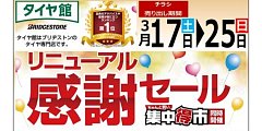 いつもタイヤ館 河内長野をご利用頂き誠にありがとうございます。 3月17日(土)より25日(日)まで、 リニューアル感謝セールを開催致します(^O^)/ タイヤ館河内長野は昨年11月にリニューアルしてから早3か月! たくさんのお客様にご来店して頂きました!! そこで感謝の気持ちをこめて「感謝セー...