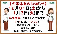 いつもタイヤ館 河内長野のホームページをご覧いただきありがとうございます! 冬季休業のお知らせ 12月 31日(土)から 1月 3日(火)まで 冬季休業とさせていただきます。 1月4日(水)より通常営業いたします。 タイヤ・カーメンテナンスのことなら タイヤ館 河内長野へぜひお立ち寄りください...