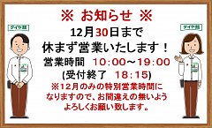 いつもタイヤ館 河内長野のホームページをご覧いただきありがとうございます! タイヤ館 河内長野は12月30日まで通常営業しております!! 営業時間 10:00~19:00 作業受付 18:15まで 12月のみの特別営業時間になりますので、 お間違いのないようよろしくお願いいたします。