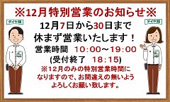 いつもタイヤ館 河内長野のホームページをご覧いただきありがとうございます! 12月のイベント 【決算セール】25日まで開催中です♪ タイヤ交換やメンテナンス用品がお得な時期です♪ 是非、ご利用下さい! ☆★☆12月定休日のお知らせ☆★☆ 12/6 が年内最後の定休日となります。 12/31は年末休業致します...