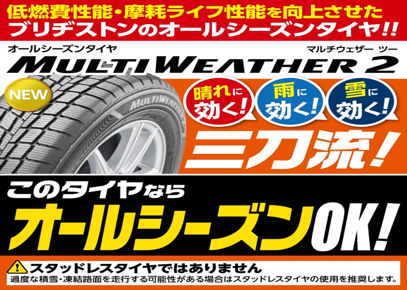 この冬、積雪でスリップが不安な方 ただ、スタッドレスタイヤまでいらないかなぁ…。 とお考えの方必見!!!! ブリヂストンのオールシーズンタイヤ試してみませんか!?!? いつもタイヤ館 河内長野のホームページをご覧いただきありがとうございます! ブリヂストンのオールシーズンタイヤ 9月1...