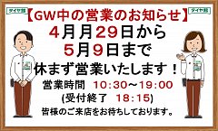 いつもタイヤ館 河内長野のホームページをご覧いただきありがとうございます! タイヤ館 河内長野は4月29日(金)から5月9日(月)まで ゴールデンウィーク中も毎日休まず営業いたします!! なお、現在好評開催中の < 春のスゴ得セール & 集中得一 >も 5月8日まで開催しております!! 最大1...