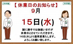 いつもタイヤ館 河内長野をご利用いただきありがとうございます! 誠に勝手では御座いますが 本日 15日 (水)は休業日とさせていただきます。 16日(木)より通常営業いたしますので、 よろしくお願いいたします。