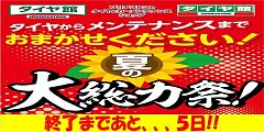 大好評開催中!! 【 夏の大総力祭! 】セール♪♪ おかげさまで連日多くのお客様にご来店いただき、 セール対象商品のタイヤをはじめとして オイル交換などのカーメンテナンスもご購入いただき 誠に有難うございます!! 好評いただいているセールですが、 ついに!! あと5日で終了となります・・...