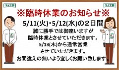 いつもタイヤ館 河内長野のホームページをご覧いただきありがとうございます! お知らせにもある通り、5月11日(火)12日(水)は臨時休業とさせて頂きます。 なお、5月13日(木)は通常営業となりますのでお間違いの無い様 宜しくお願い致します。 <営業時間> 10:30~19:00 作業...