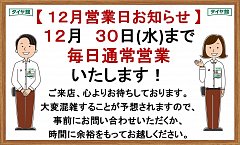 いつもタイヤ館 河内長野のホームページをご覧いただきありがとうございます! 【 12月の営業日のお知らせ 】 12月30日(水)までタイヤ館 河内長野は通常営業いたします♪♪ <営業時間> 10:00~19:00 作業最終受付18:15 作業内容・受付時間なども通常通りですので、 タイヤ・カー...