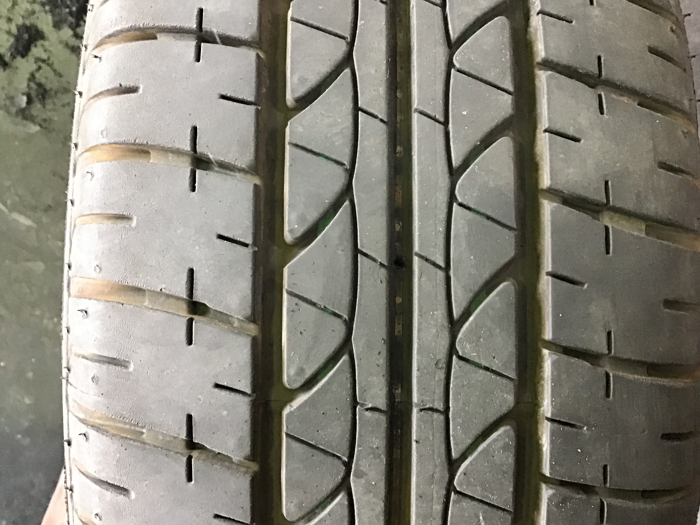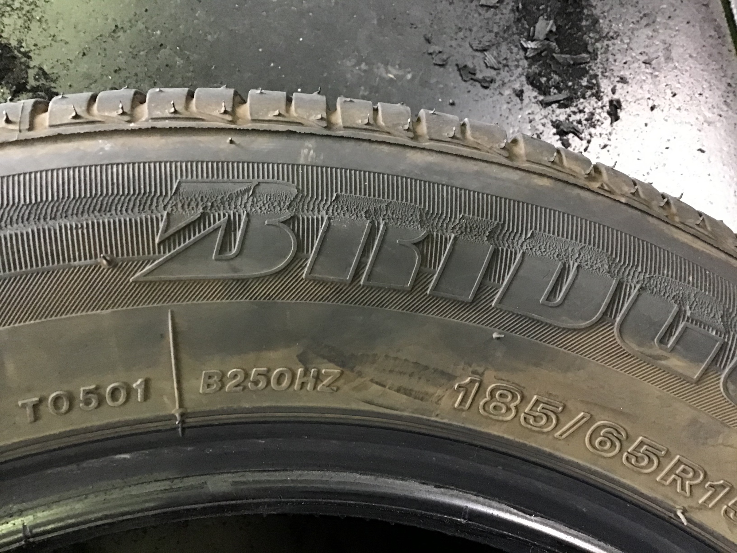 タイヤの側面部をみると、「BRIDGESTONE」の上部がすり減っています。