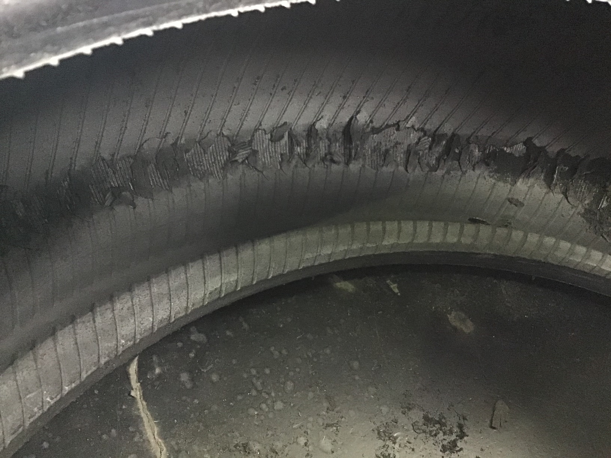 こちらが先ほどのタイヤの内側、ご覧の通り、激しく損傷してしまっていることがわかります。