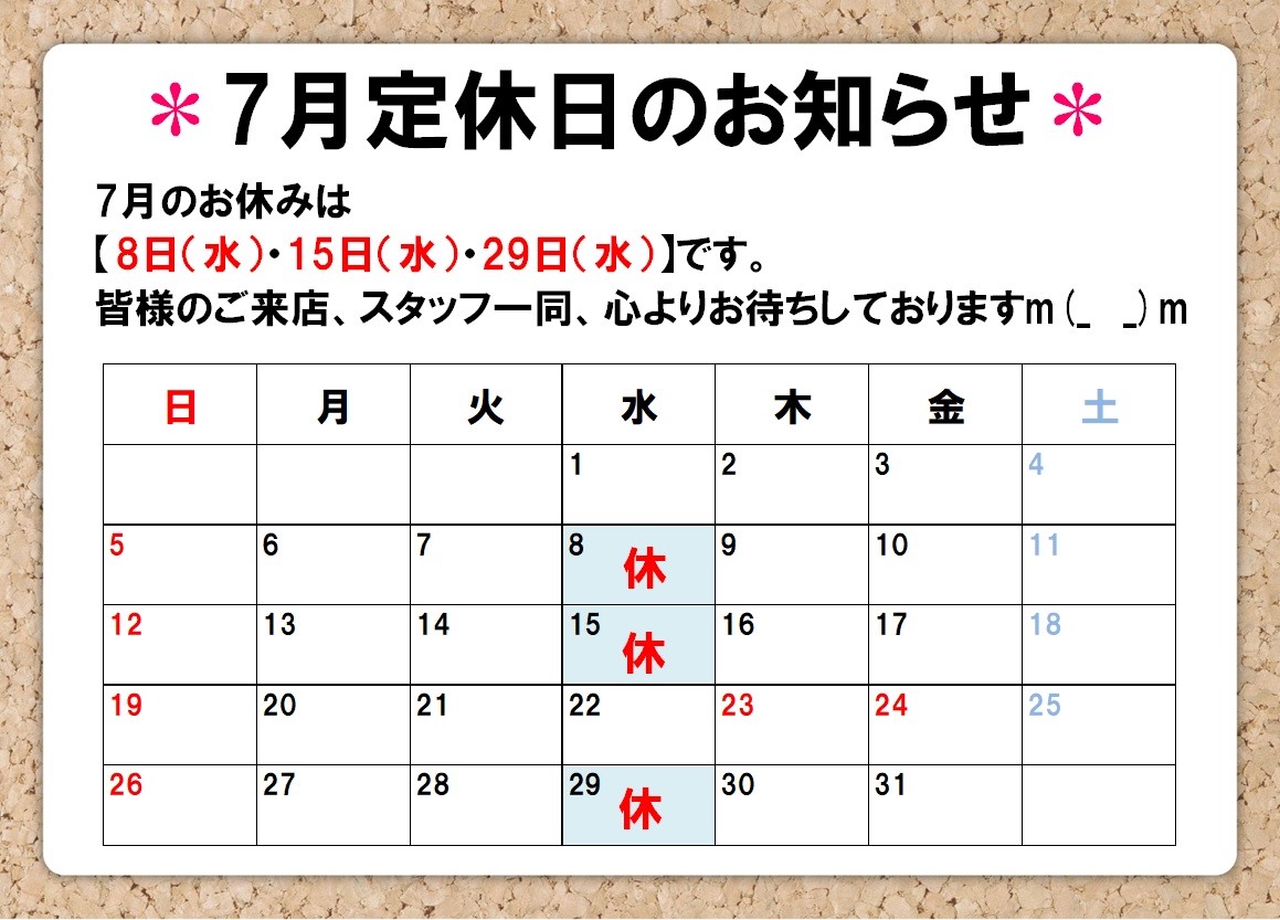 7月定休日のご案内 ポスト 2020年6月25日 皆様こんにちは! タイヤ館川口店 スタッフの疋野です^^ 7月の定休日のご案内です!! 8日、15日、29日がお休みとなります。 ※1日、22日の水曜日は通常営業となります。 ご来店の参考までに★ 皆様のご来店、スタッフ一同、心よりお待ちしております♪ 担当:疋野