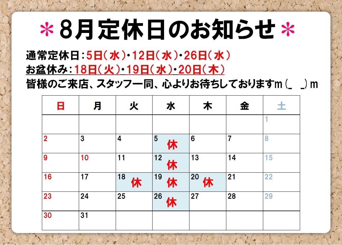 8月定休日のご案内 ポスト 2020年7月29日 皆様こんにちは! タイヤ館川口店 スタッフの疋野です^^ 8月の定休日のご案内です!! 通常定休日として5日、12日、26日がお休みで、 お盆休みとして18日、19日、20日がお休みとなります。(火・水・木と3連休となります。) ご迷惑をおかけしますがご理解のほどよろしくお願いいたします。 皆様のご来店、スタッフ一同、心よりお待ちしております♪ 担当:疋野
