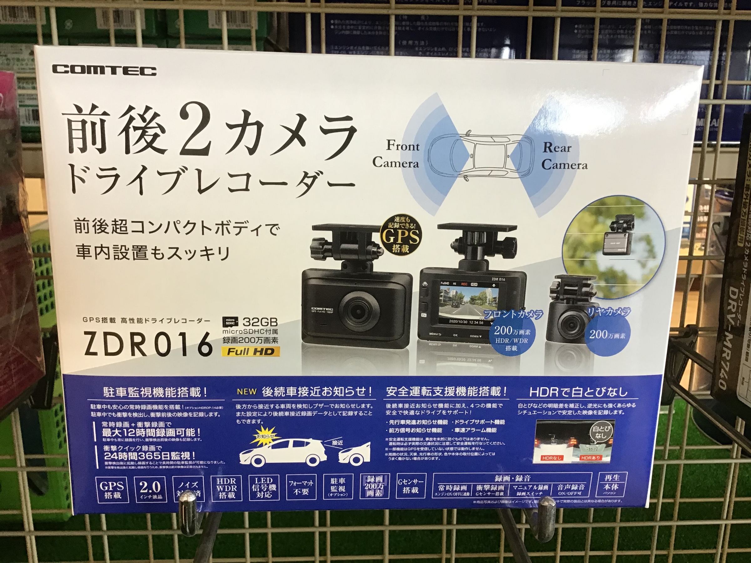 今回紹介するのは コムテック ZDR-016です。前後カメラ機能付きで