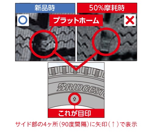 冬用タイヤとして使えなくなります。溝の深さを点検する場所を「プラットホーム」と呼びますが、