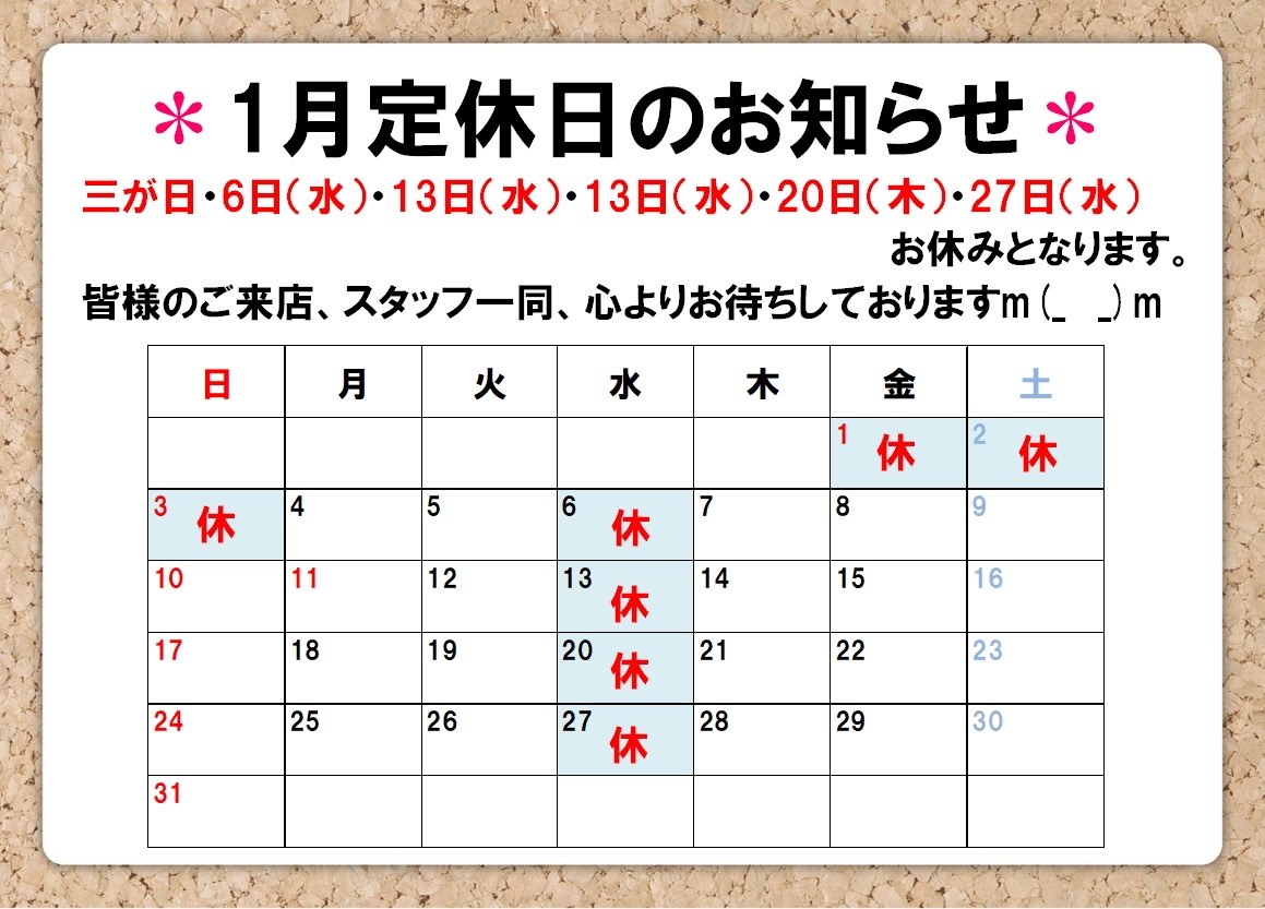 1月定休日のご案内