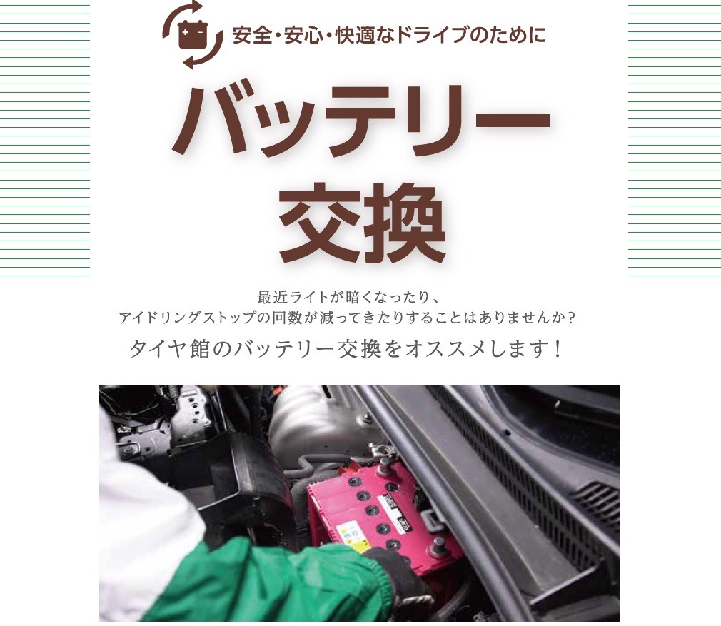 ☆バッテリー交換☆ ポスト 多くの電力を消費する現在のクルマは、安定した電力を供給するために、バッテリー、オルタネータ(発電機)を良好なコンディションに保つことが必要です。バッテリーの交換目安は2~3年ですが、交換後徐々に性能低下がはじまり、突然本来の性能が出せなくなりますので、定期点検と早めの交換をおすすめしています。 ※持ち込みでの作業は行っておりません。 ※一部車種、輸入車は作業ができない場合がございます。 ※商品代金は別途となります。 関連動画 カテゴリ:商品情報 その他商品・サービス