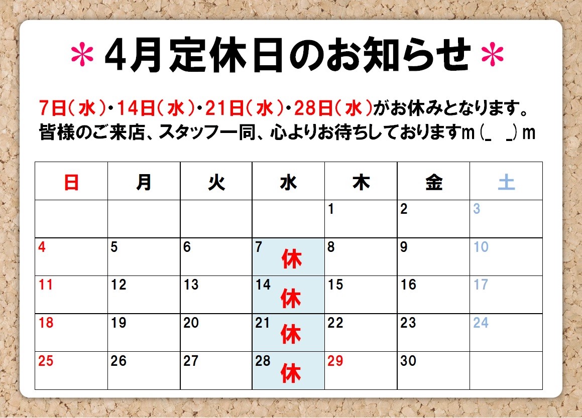 4月定休日のお知らせ