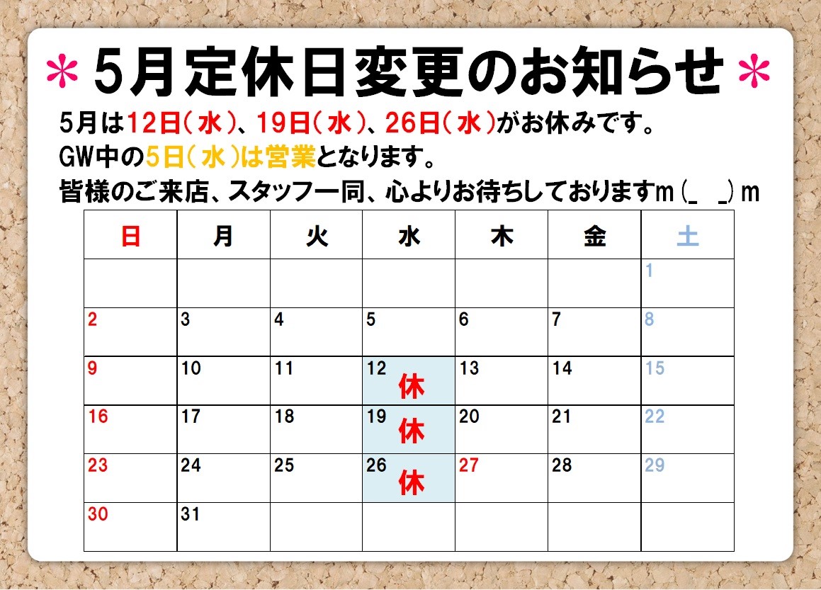 5月定休日のお知らせ!