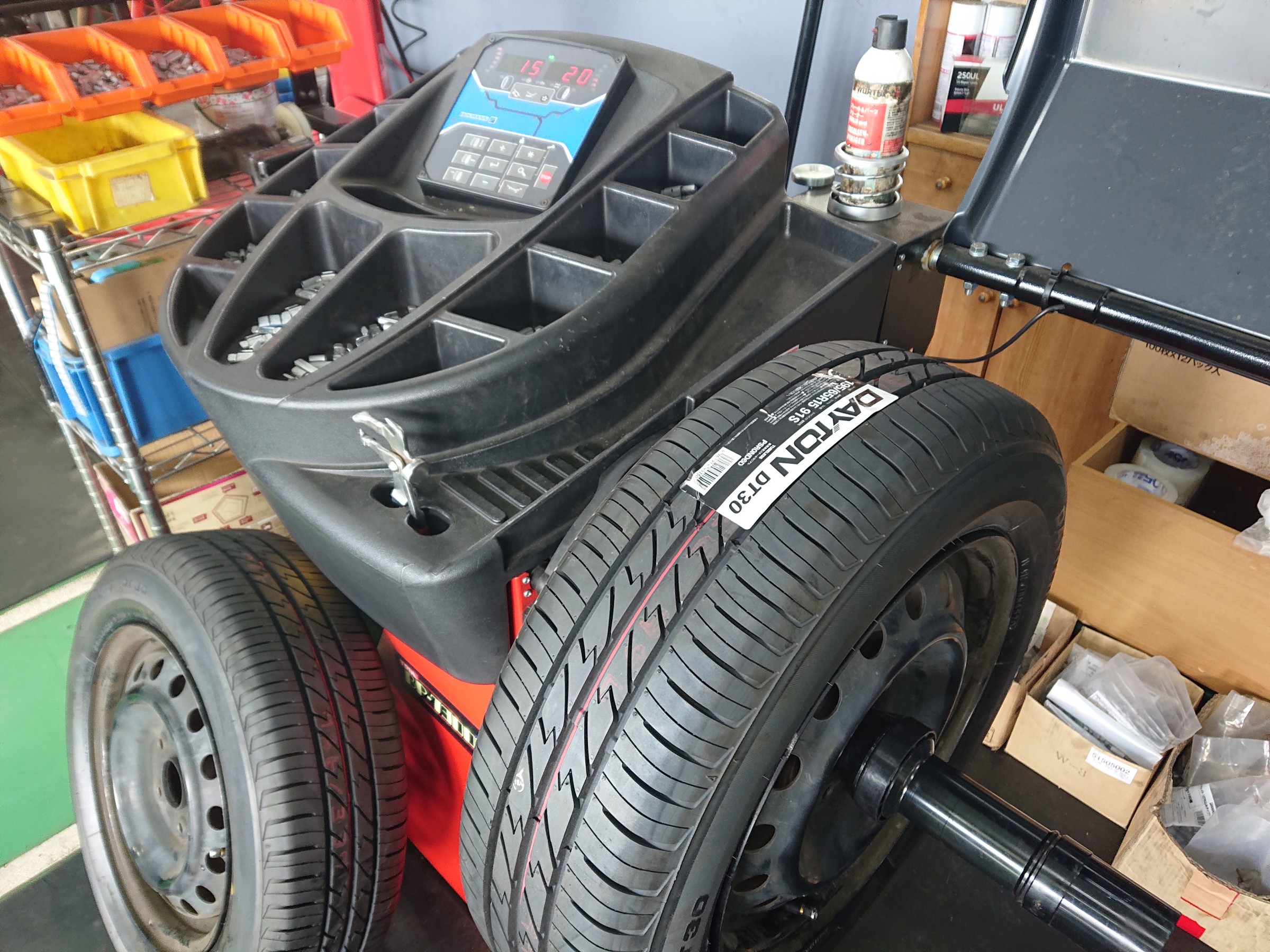 そして、タイヤ組み込みの後は、走行中ハンドル振動が発生しないようにホイールバランサーで補正!