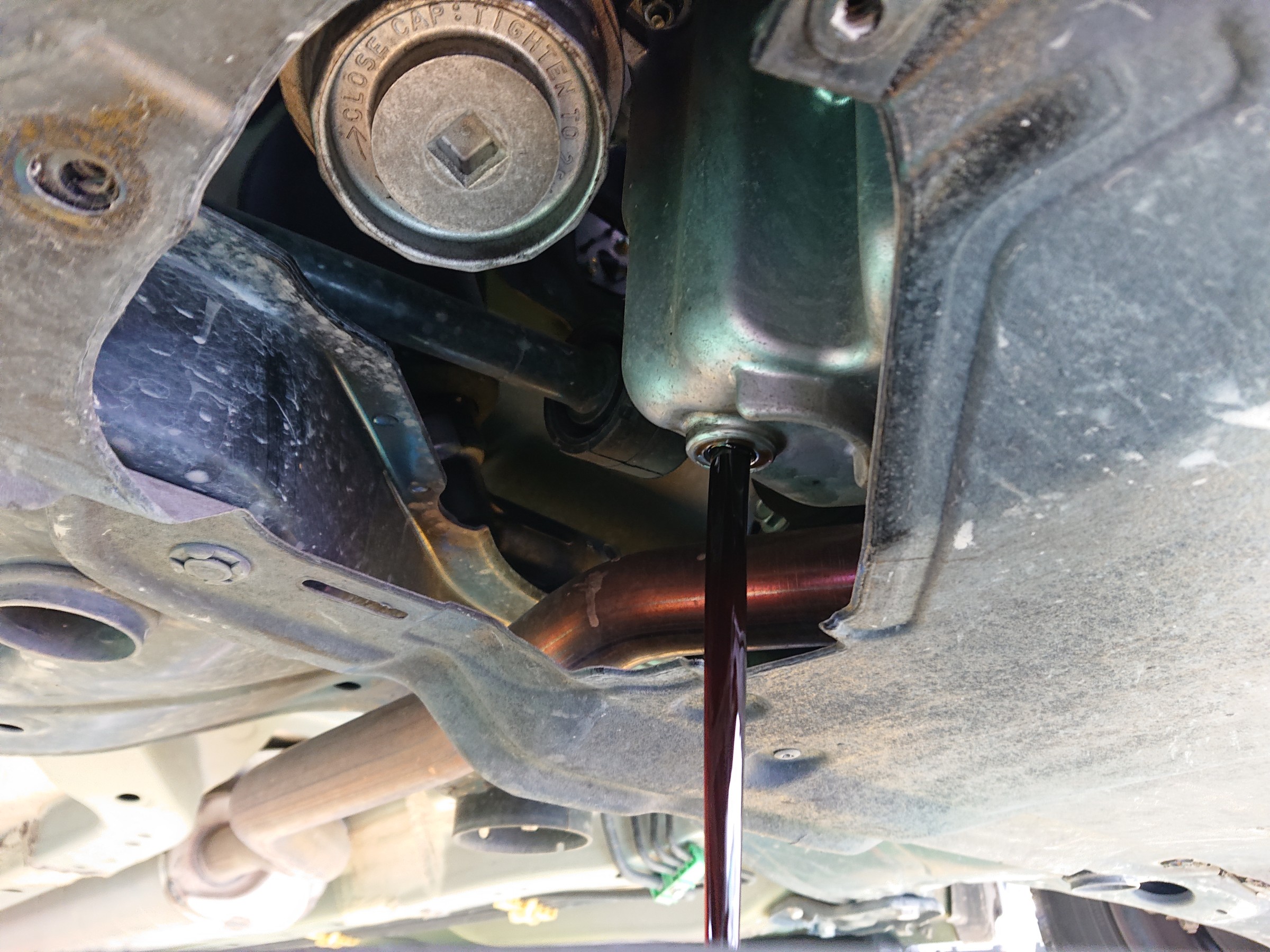先ずは車両をリフトアップさせ、古いエンジンオイルを