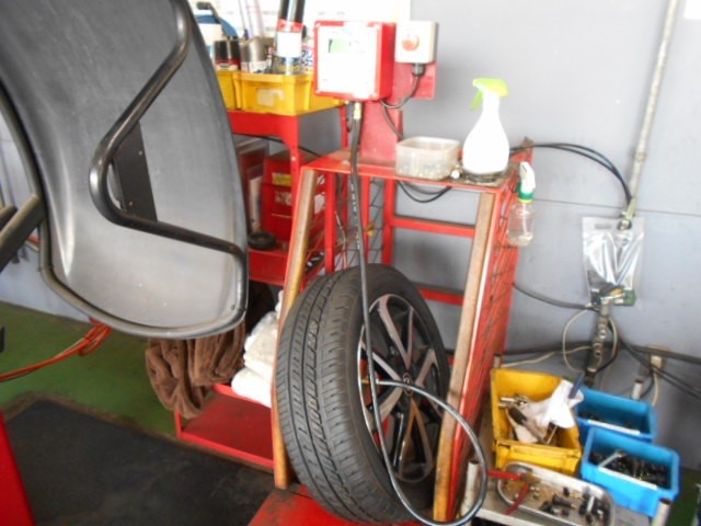 タイヤを組んで窒素ガスを充填し漏れチェックをして