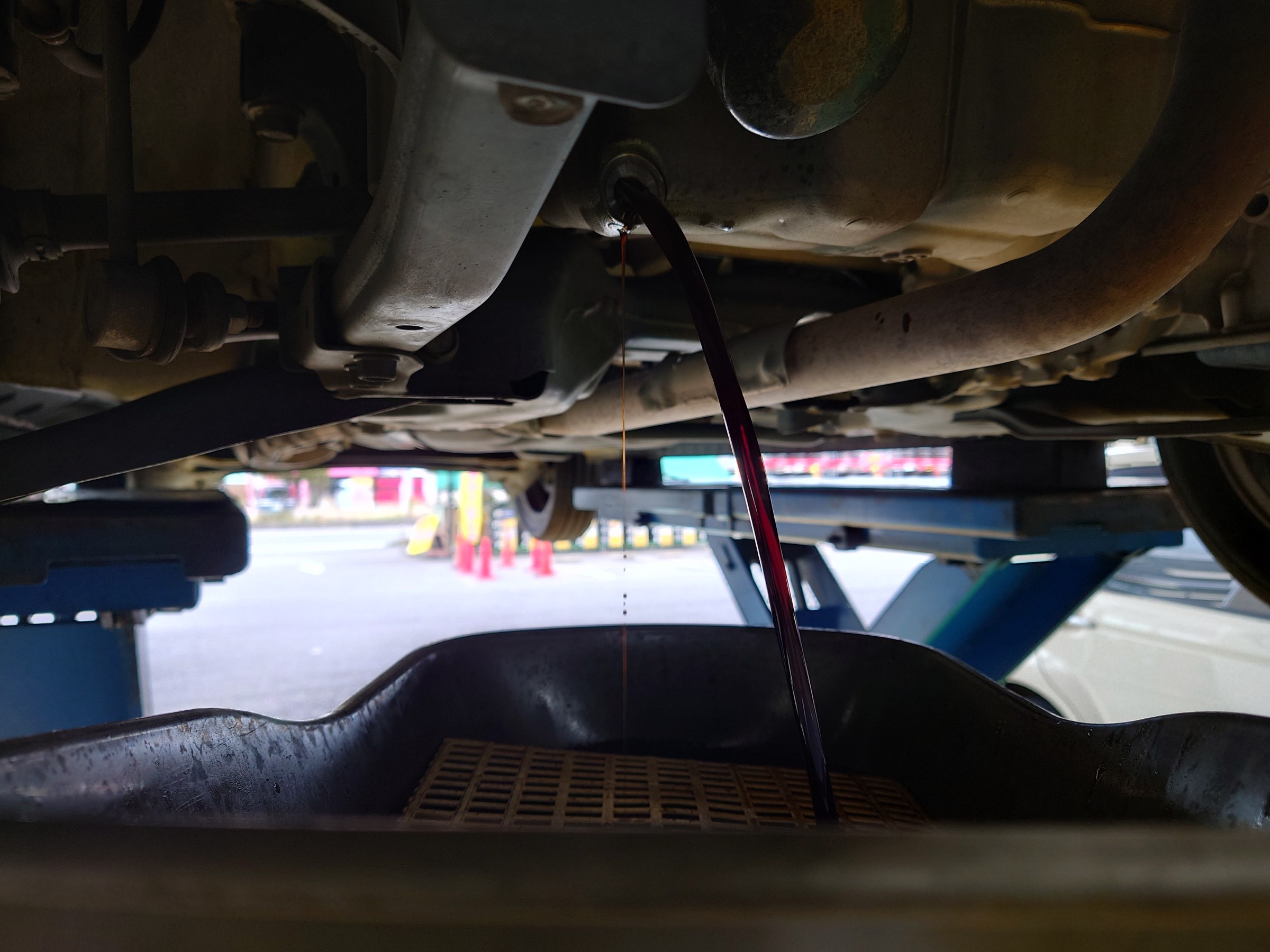 先ずは車両をリフトアップさせ、古いエンジンオイルを