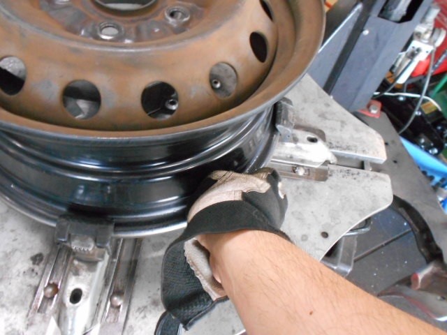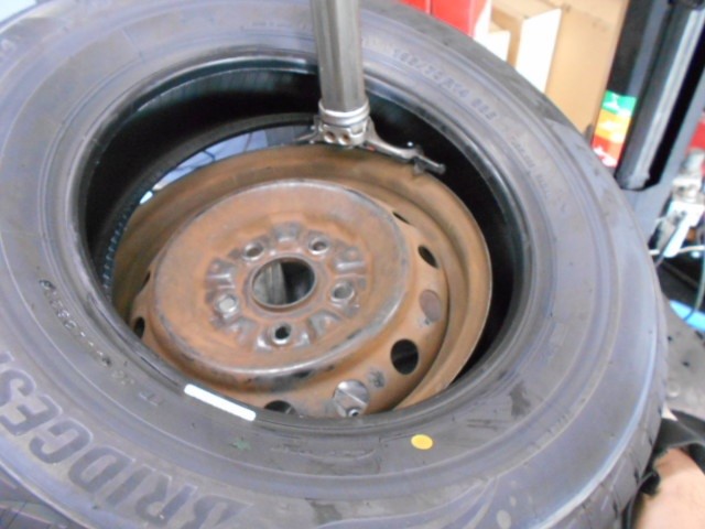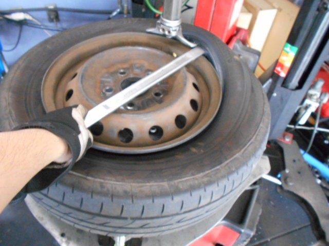 古いタイヤをアルミホイールから外してリム清掃とチューブレスバルブを