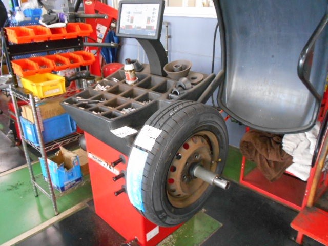 タイヤを組んで空気を入れ漏れチェックをしてバランス調整を行います。
