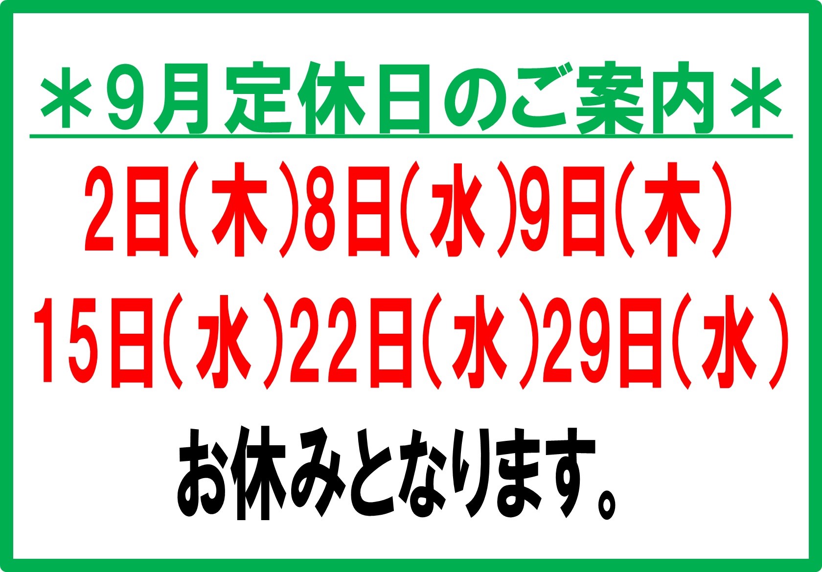 9月定休日のお知らせ ポスト 2021年8月31日 タイヤ館川口店です 当店ホームページをご覧いただきありがとうございます! 9月度の定休日のお知らせです 9月1日は水曜日ですが通常営業となります 9月2日,9月9日は木曜日ですが、こちらは臨時休業となりますのでご注意ください ご不便おかけしますが、 皆様のご理解とご協力よろしくお願いいたします