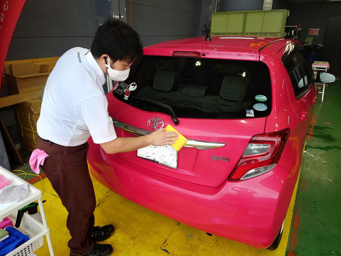 4名在席、お客様の愛車をキレイにしてお返しします。
