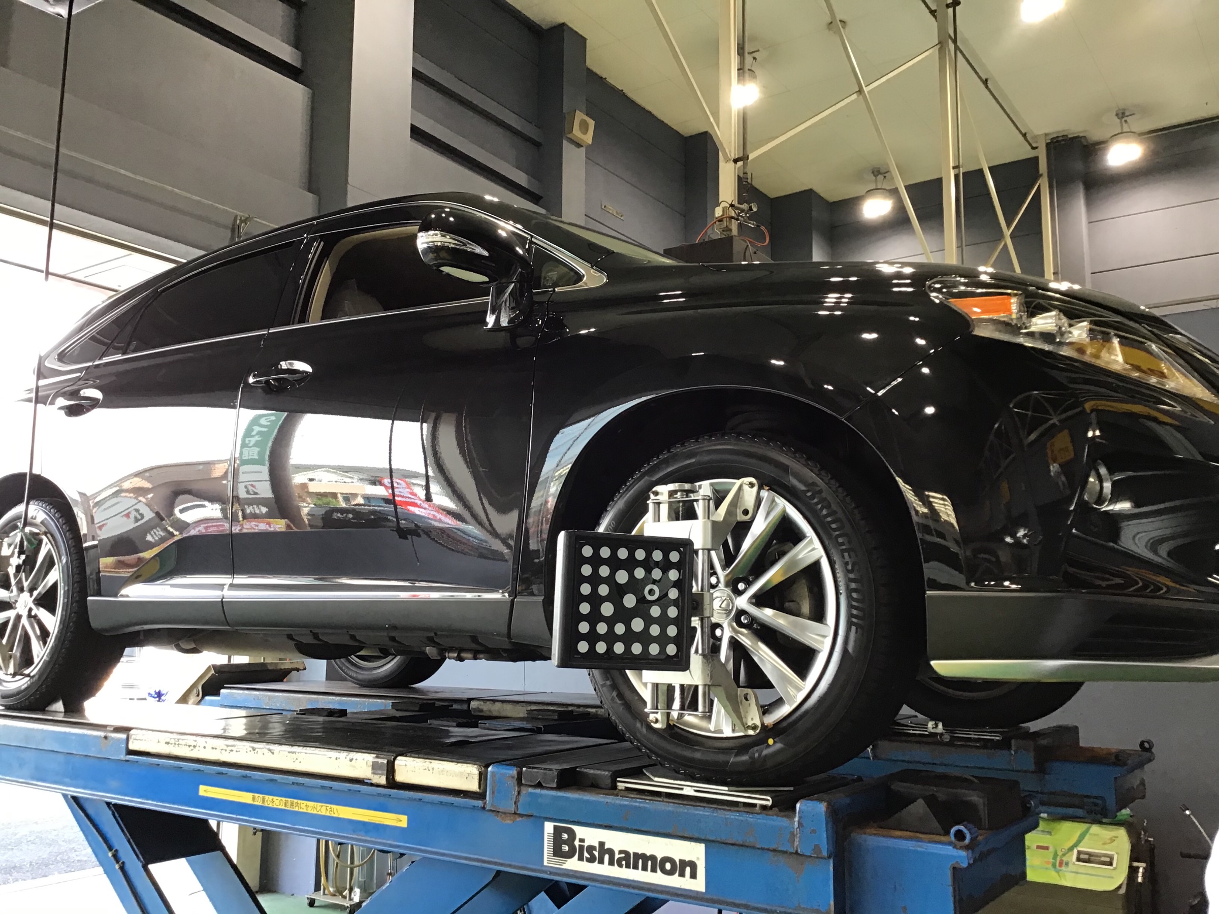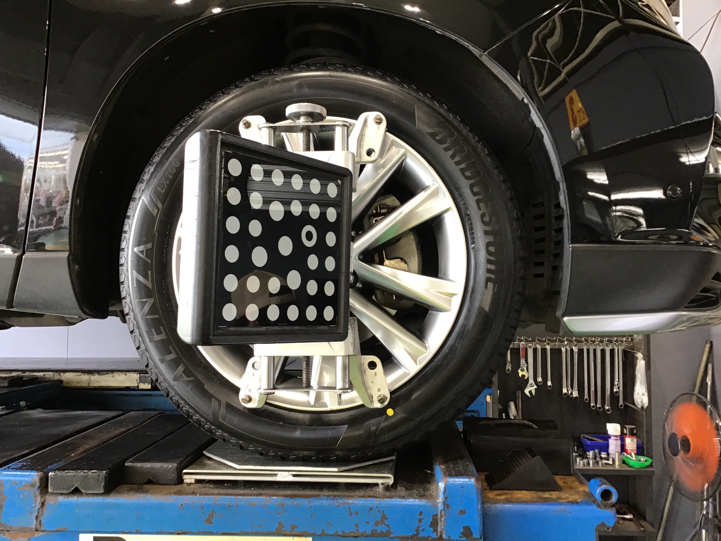 タイヤ交換した後は当店自慢のアライメント調整です。新品の状態でセンサーを装着します。