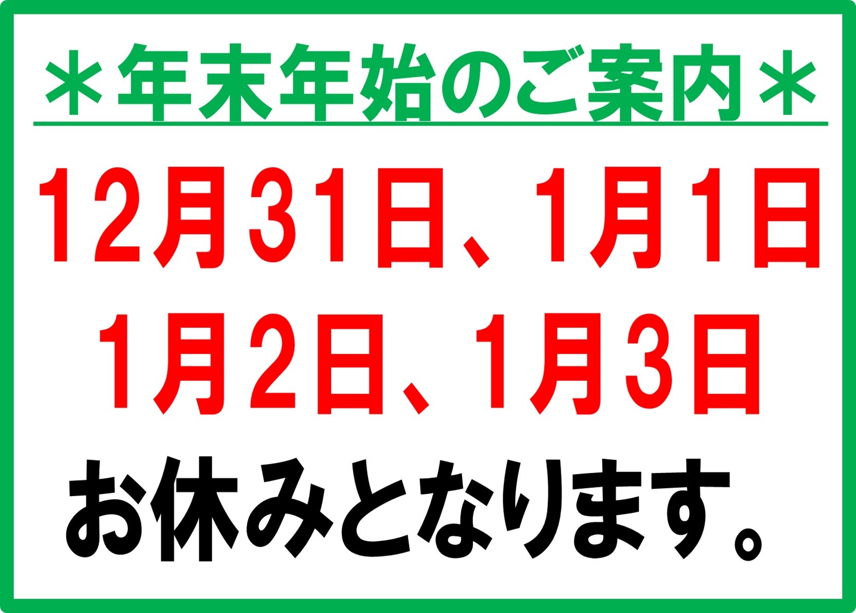 年末年始 定休日のご案内 ポスト 2021年12月29日 ホームページをご覧いただきありがとうございます! 年末年始、定休日のご案内です ご不便おかけしますが、皆様のご理解とご協力をよろしくお願い致します!!