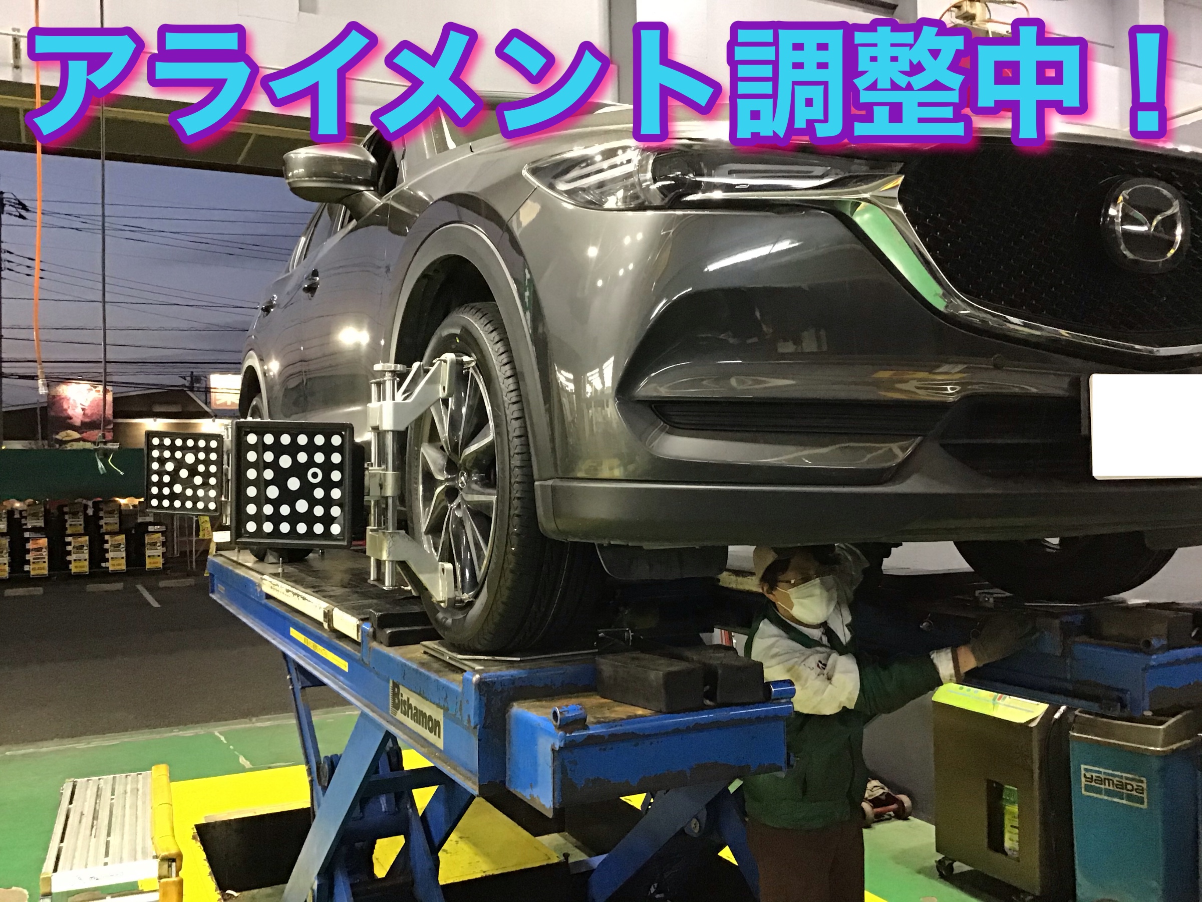 タイヤ取り付け後は当店の人気作業のアライメント調整をしていきます。