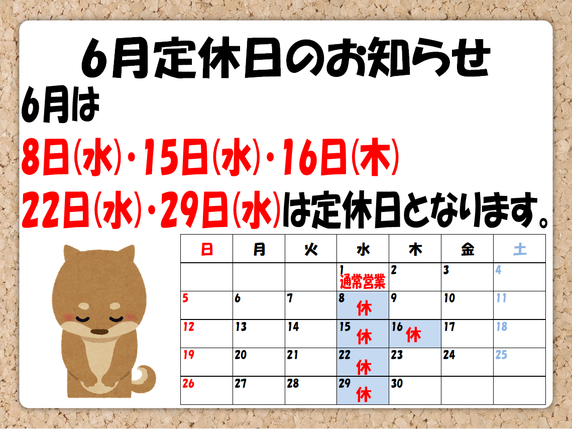 6月定休日のお知らせ