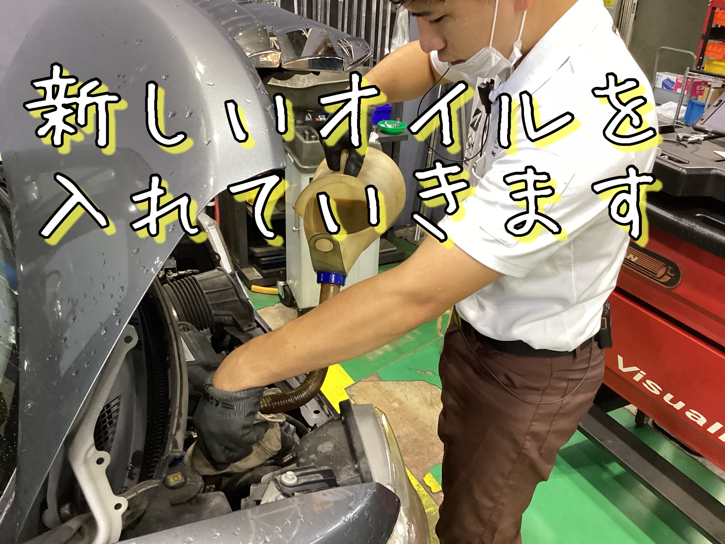 新しいエンジンオイルを規定量入れていきます。