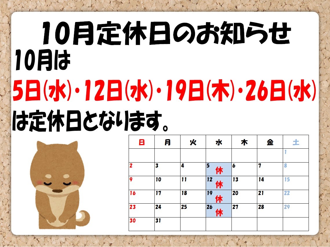 10月定休日のお知らせ ポスト 2022年9月30日 こんにちは。 タイヤ館川口店です。 いつも当店のホームページをご覧いただきありがとうございます。 10月定休日のお知らせです。 10月は5日(水)・12日(水)・19日(木)・26日(水)が 定休日となります。 ご迷惑をお掛けいたしますが、何卒ご理解いただきます様お願い致します。 今後もコロナウイルス感染対策として従業員のマスク、消毒は継続していきますので 安心してご来店ください。
