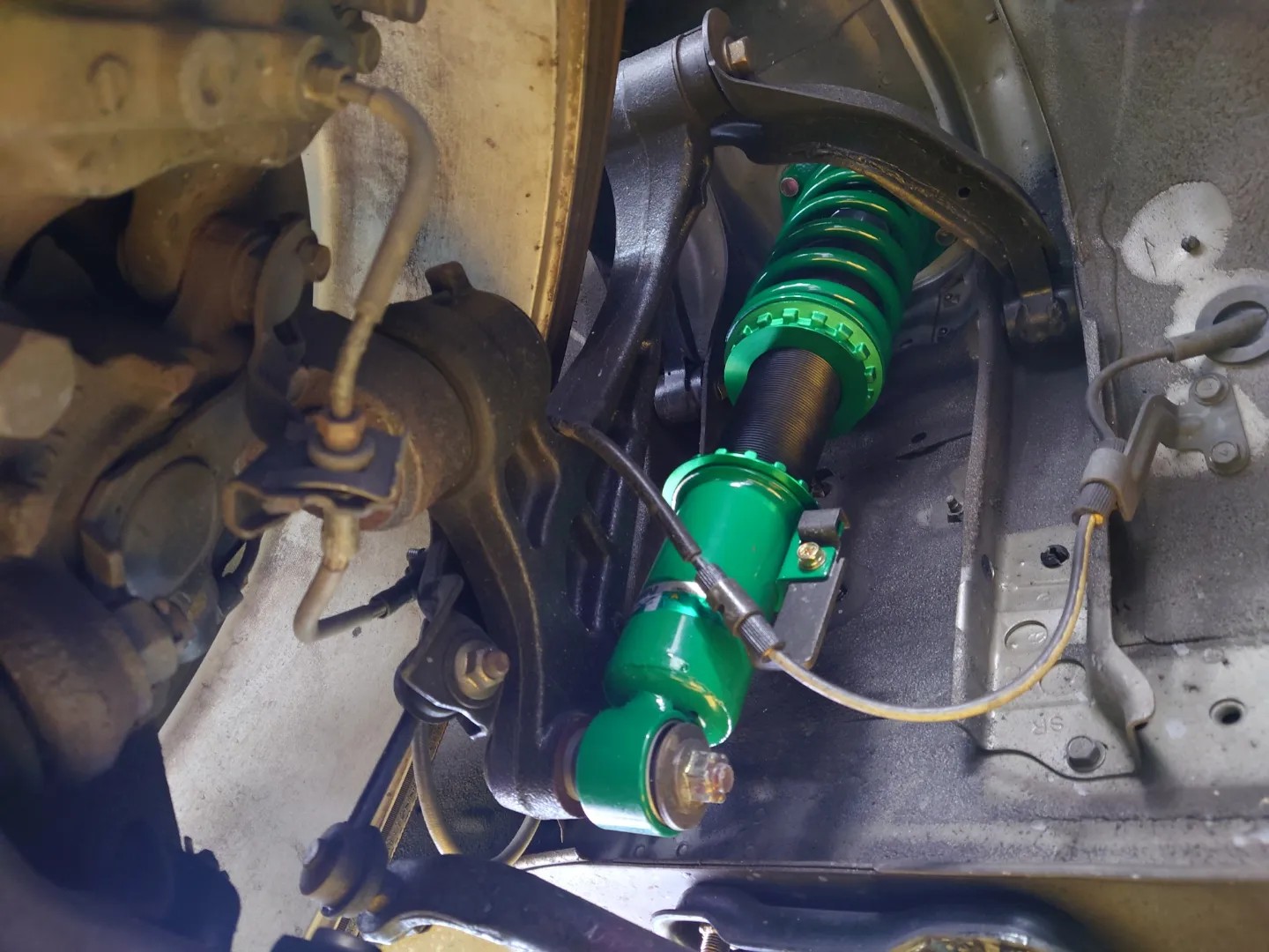 ニッサン R34 スカイラインの車高調キット取付作業!