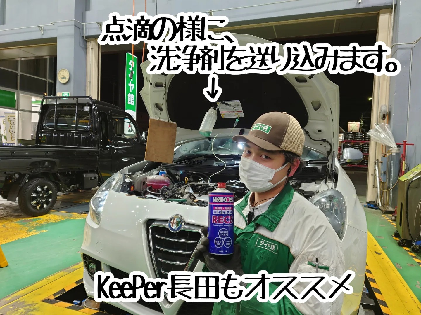 RECSは、インテークマニホールドへ直接洗浄剤を投入し、吸気系に溜まったカーボン等を洗浄する作業です。