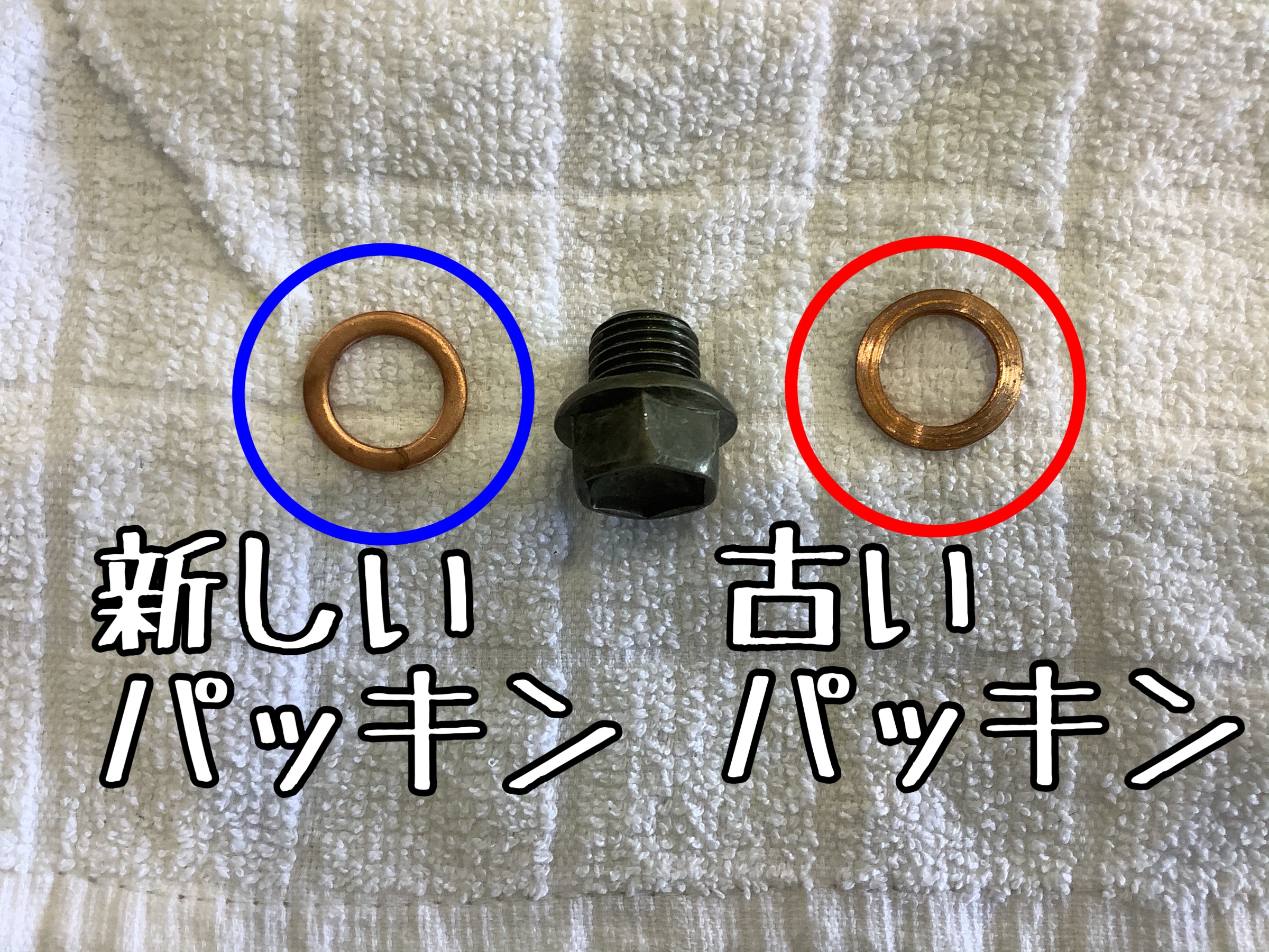 オイルが抜けるのを待つ間に、ドレンボルトのドレンパッキンを新しいのと交換!