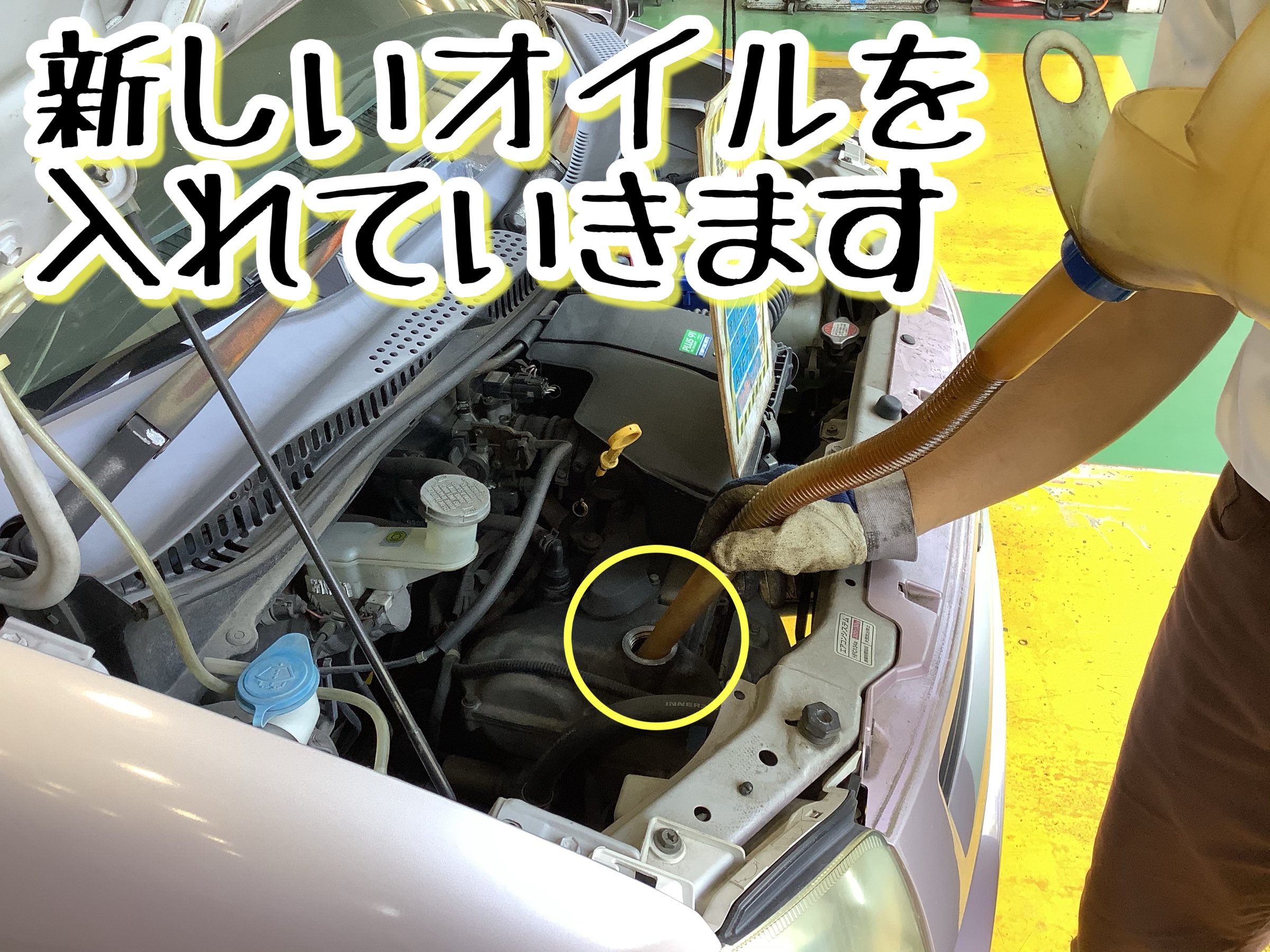 新しいエンジンオイルを規定量入れていきます。
