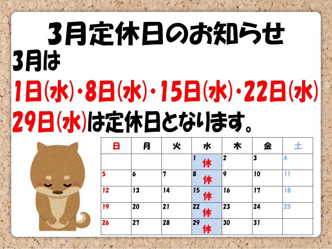 3月定休日のお知らせ ポスト 2023年2月27日 こんにちは。 タイヤ館川口店です。 いつも当店のホームページをご覧いただきありがとうございます。 3月定休日のお知らせです。 3月は1日(水)、8日(水)、15日(水)、22日(水)、29日(水)が 定休日となります。 何卒ご理解いただきます様お願い致します。 今後もコロナウイルス感染対策として従業員のマスク、消毒は継続していきますので 安心してご来店ください。