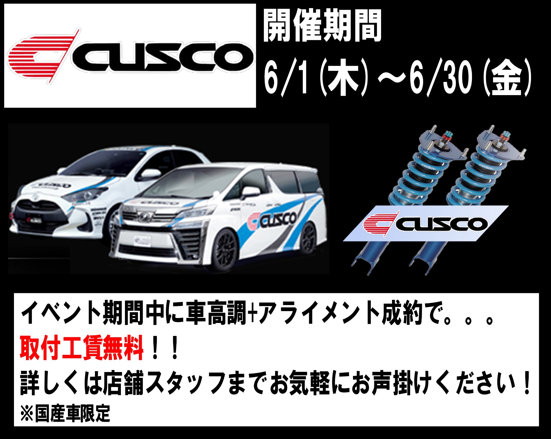 CUSCO イベント開催中! ポスト 2023年6月2日 こんにちは。 タイヤ館川口店です。 6/1(木)~6/30(金)まで ★CUSCO足回りイベント★開催中です! 期間中に車高調+アライメントご成約で、取付工賃無料! (※国産車限定) 詳しくは当店スタッフまでお問合せ下さい。 お見積りだけでも大丈夫です! 皆様のご来店を、スタッフ一同心よりお待ちしております。 住所:336-0015埼玉県さいたま市南区太田窪3515-6 電話番号: 048-887-6833 担当:吾妻
