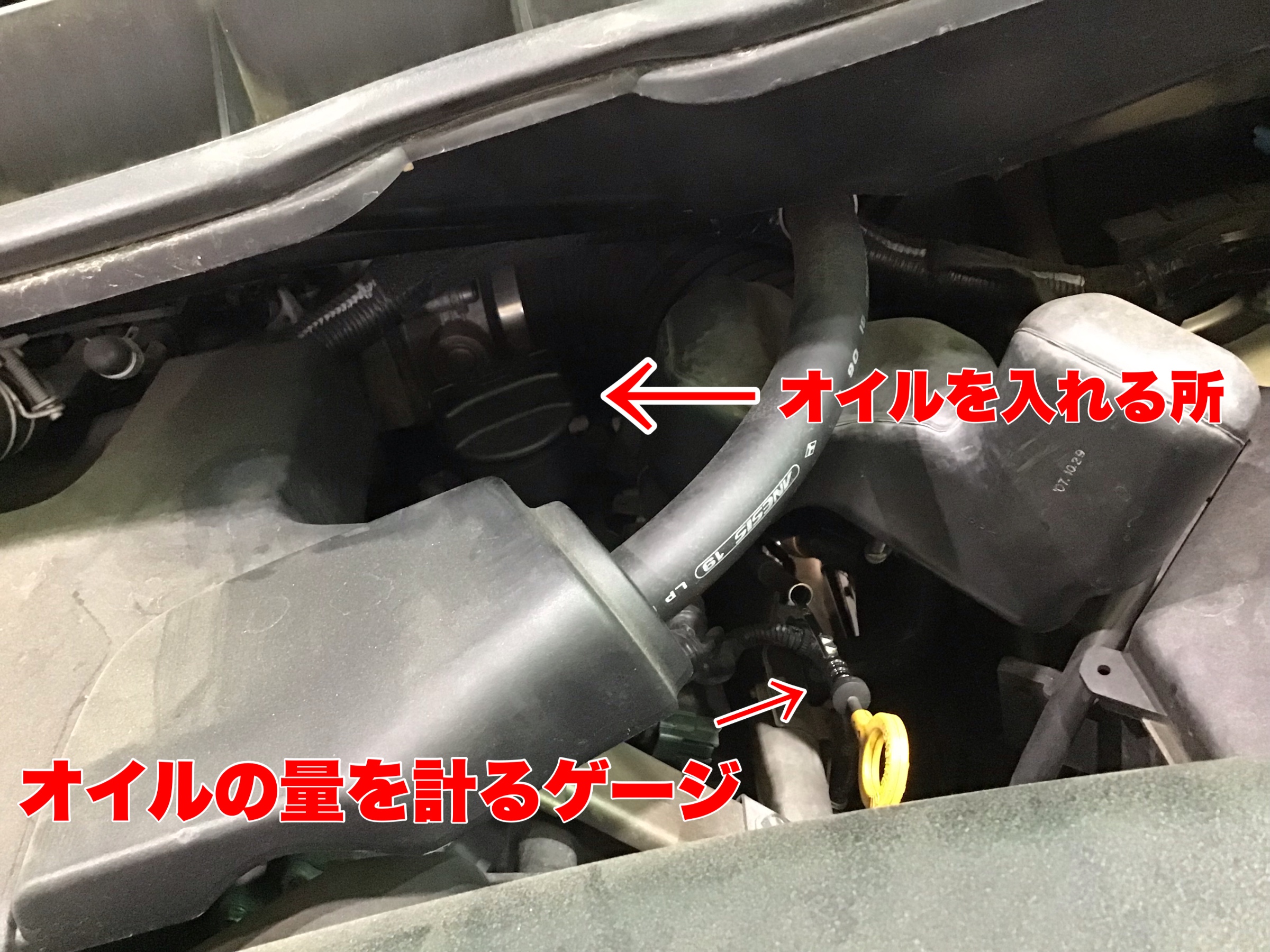 まずは、オイルを入れるところ(オイルフィラー)のキャップを緩めます。