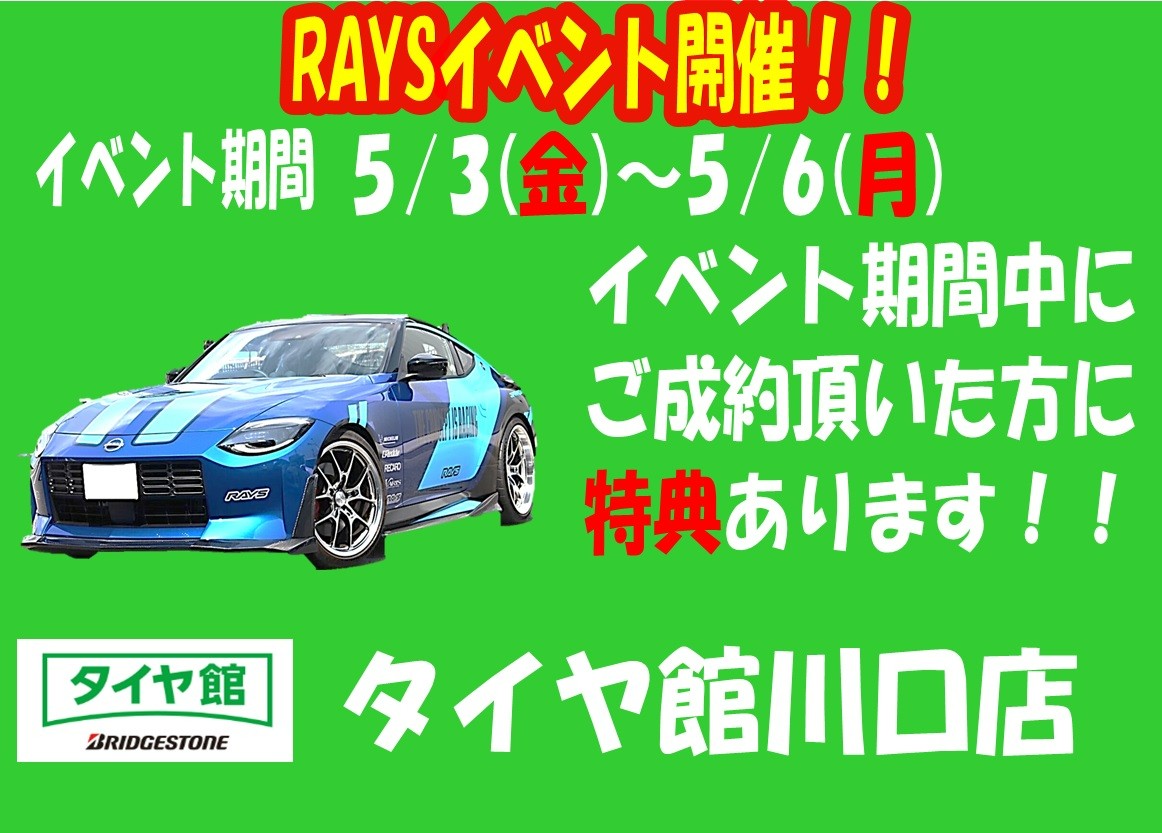 レイズイベント開催のお知らせ ポスト 2024年4月28日 皆さんこんにちは!! レイズイベント開催します(^_-)-☆ ゴールデンウィークの5月3日、4日、5日、6日を使って開催‼︎ 滅多にお目にかからないホイールも展示します! 勿論、仮あても出来ますのでお気楽にどうぞ!! イベント開催時にご成約頂いたお客様にグッズをプレゼント致します‼︎ 皆様、是非ご来店お待ちしております(^O^) 担当:鈴木