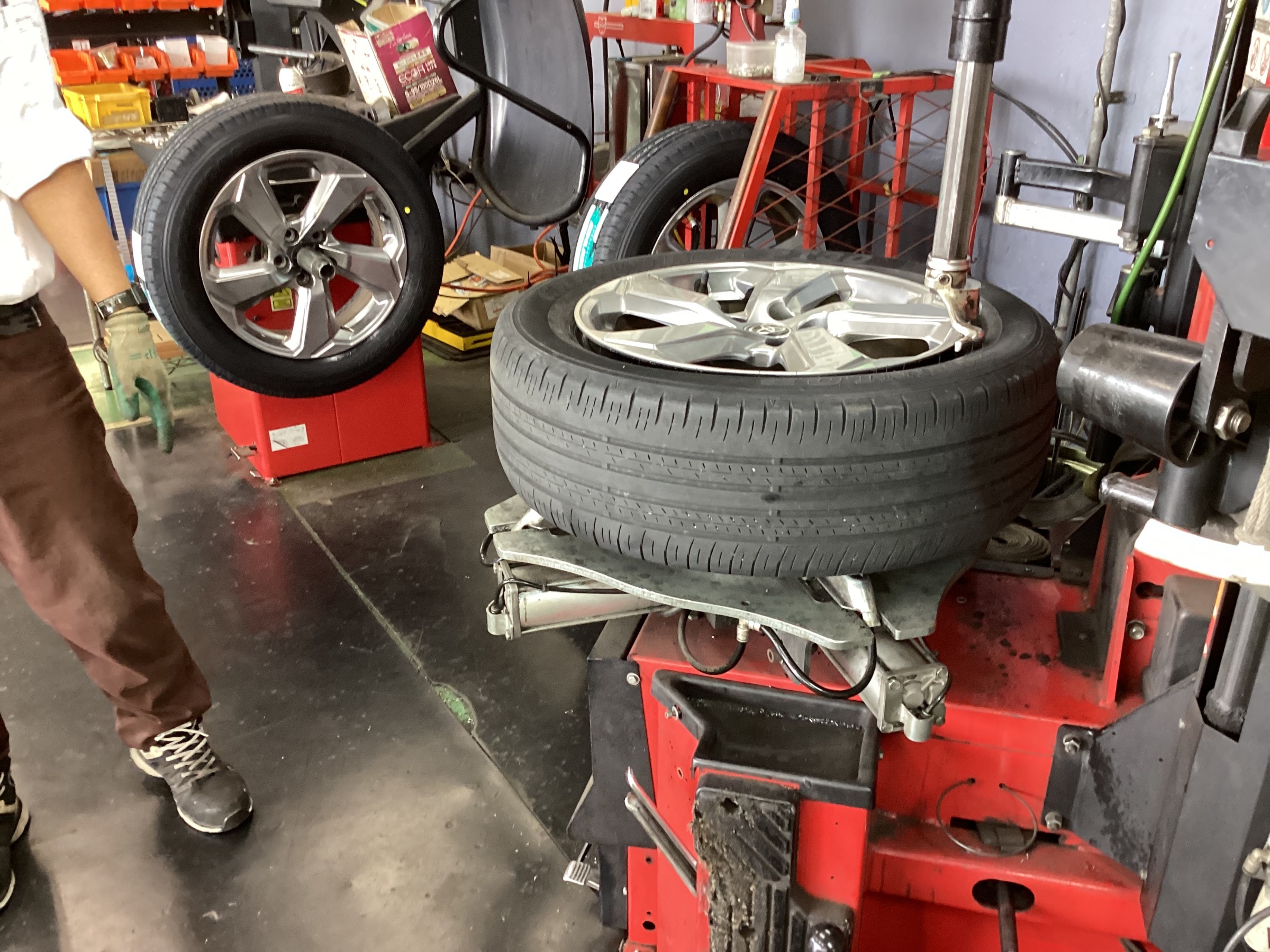 古いタイヤをバラして、新しいタイヤを組んでいきます。