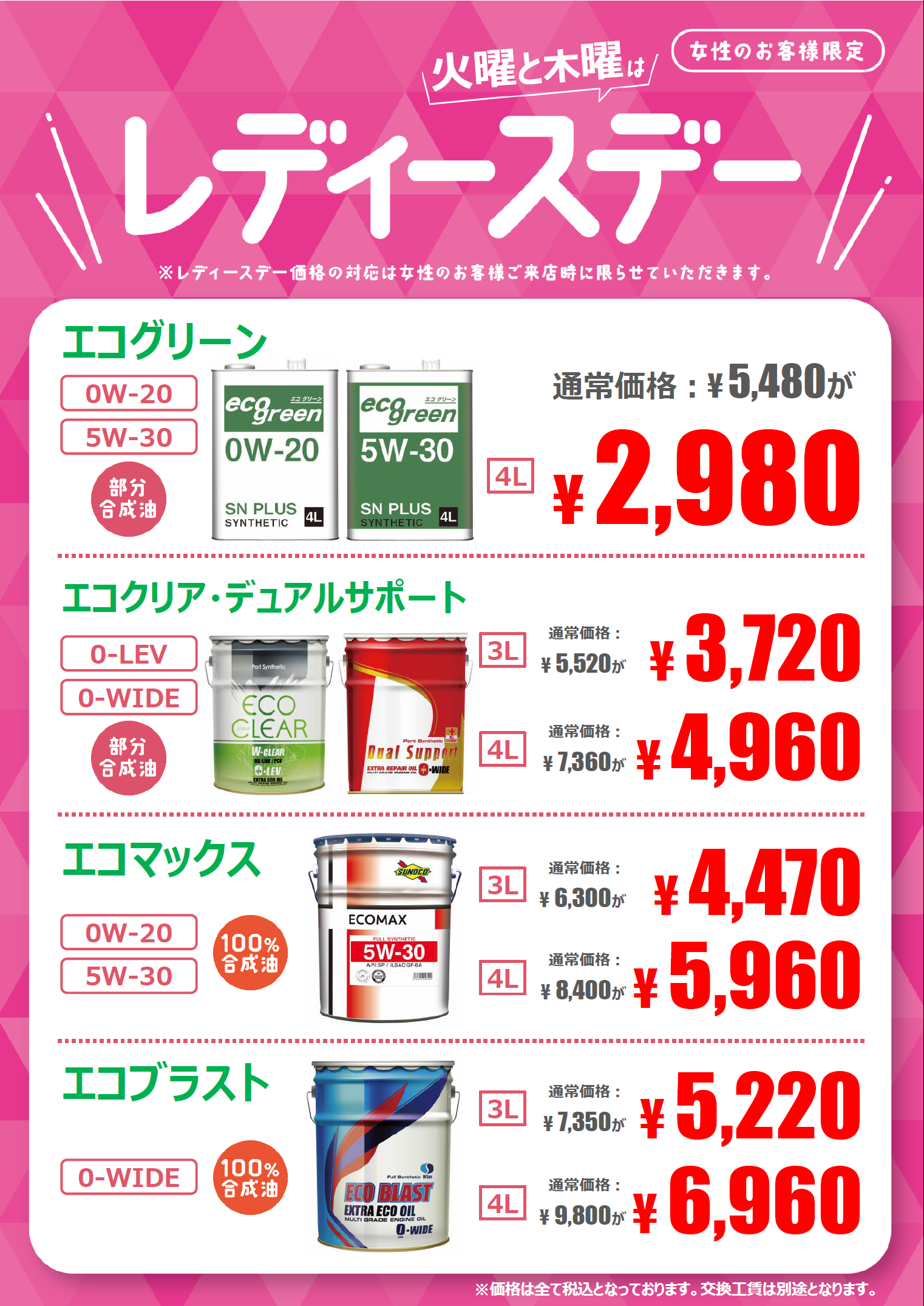 ☆毎週火曜日、木曜日はレディースデー!☆ ポスト 2024年6月20日 毎週火曜日と木曜日はレディースデー!! オイル交換がとってもお得です♪ さらにお得なメンテナンスパックもご用意しておりますので、 お得なこの機会にぜひご利用くださいませ♪ カテゴリ:お知らせ