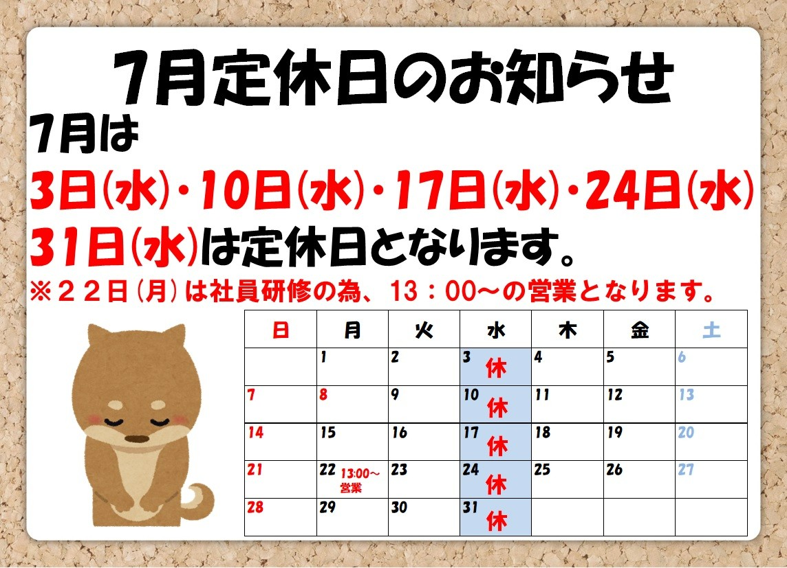 定休日のご案内! ポスト 2024年6月29日 皆様こんにちは! いつもタイヤ館川口をご利用いただきありがとうございます★ 7月定休日のお知らせです! 7月は3日(水)・10日(水)・17日(木)・24日(水)・31日(水)を お休みとさせて頂きます。 また22日(月)は社員研修の為、13:00~の営業となります。 何卒ご理解頂きますようお願い致します。