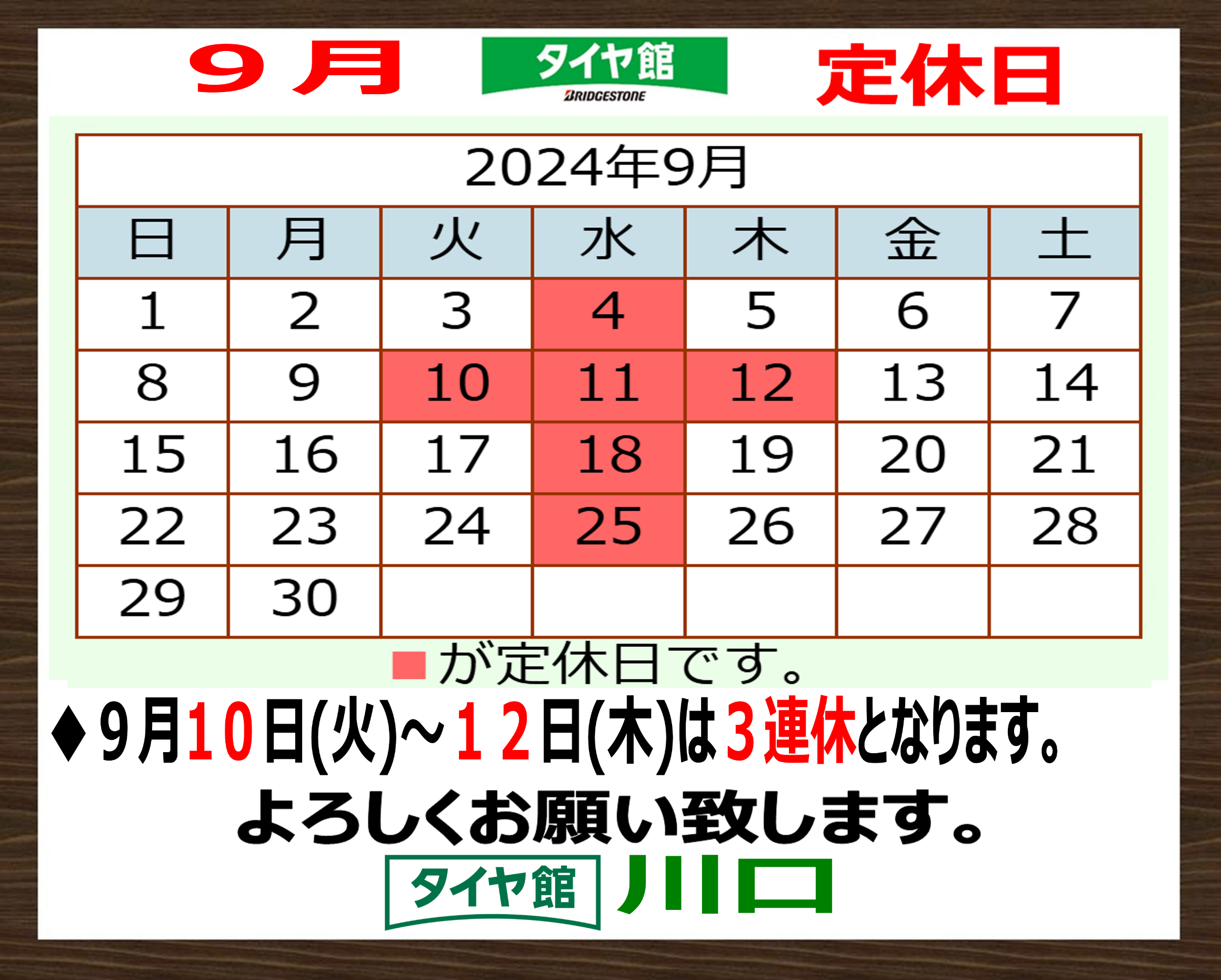 定休日のご案内 ポスト 2024年8月31日 皆様こんにちは! いつもタイヤ館川口をご利用いただきありがとうございます★ 9月定休日のお知らせです! 9月は4日(水)・10日(水)・11日(水)・12日(水)・18日(水)・25日(水)を お休みとさせて頂きます。 また10日(火)~12日(木)は店舗連休となります。 大変ご迷惑をお掛け致しますが 何卒ご理解頂きますようお願い致します。 カテゴリ:お知らせ