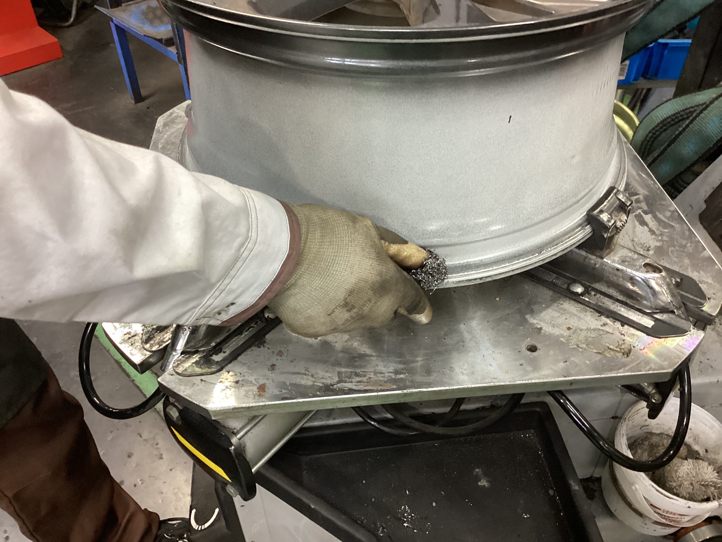 新しいタイヤを組む前に、前着いていたタイヤのゴムの汚れを落とします。